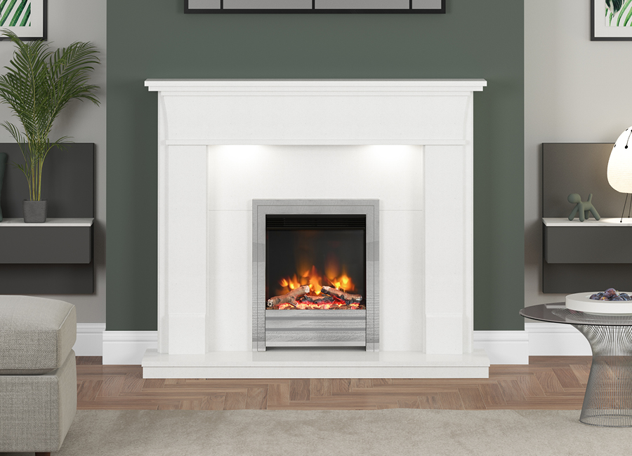 50" Roesia micro marble surround is designed and manufactured in our UK workshops with our beautiful micro marble material that must been seen to be believed and fully appreciated first hand. Complete with optional Motion Sense LED mantle lights to enhance and provide a warming soft glow.