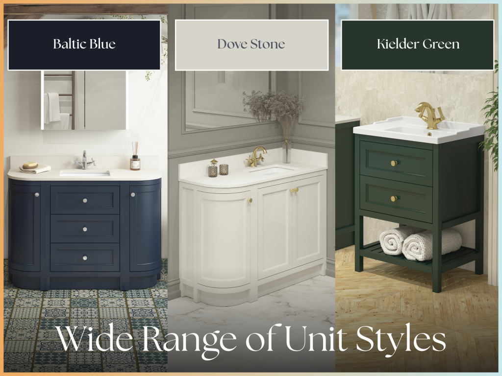 The collection offers a considered selection of unit styles designed to suit a wide range of bathroom layouts, including drawer basin units, door basin units, combination door/drawer curved units, corner curved units, and drawer/shelf units!